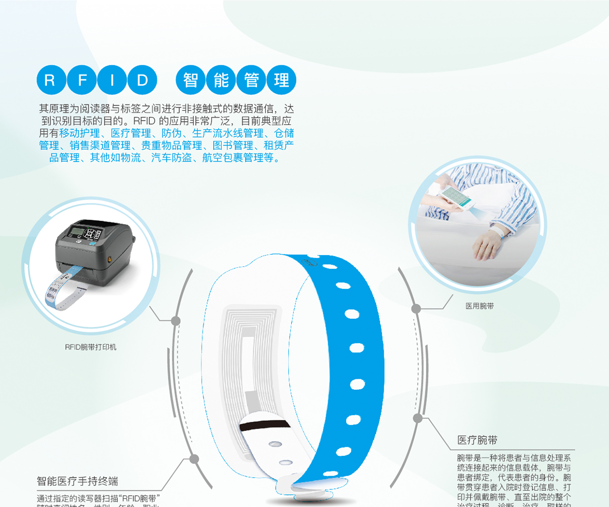 除了常规RFID射频带来的功能外,其好处在于不仅信息内容清晰规范,而且因为识别带上面具备条形码,应用十分广泛,从输液、打针到检验、手术等医院常规活动中,都可以用扫描的方式快速准确地读取病人的信息,从而提高医护人员的工作效率和服务水平。