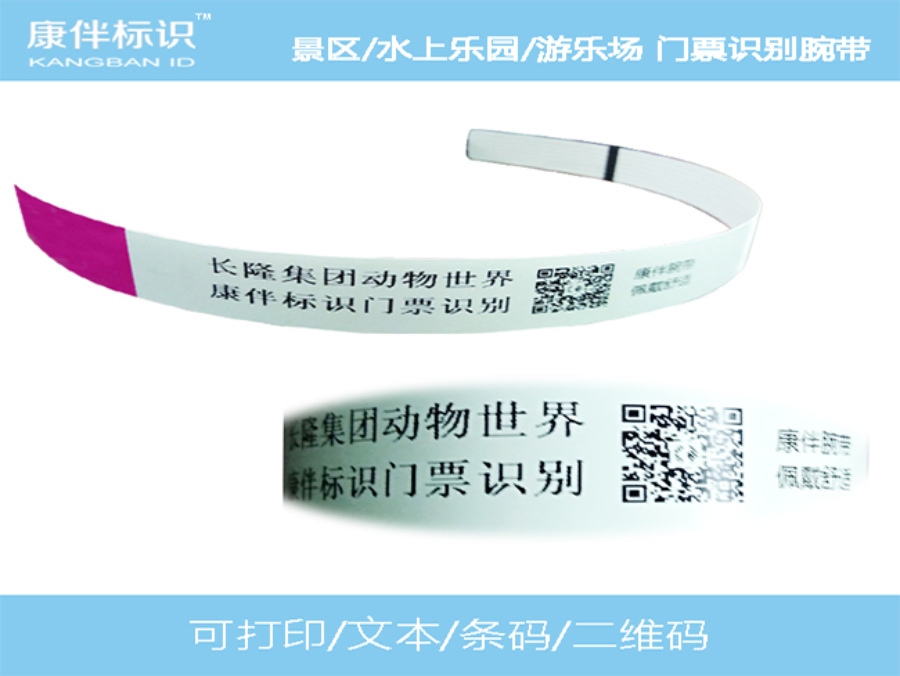 通用型娱乐腕带是我公司自主设计的产品,颜色多样,款式新颖,适用范围广,高端品质。广泛应用于景区、游乐园、水上乐园、赛事、体育馆、展会、演唱会、电影院、KTV、夜店、酒吧、校园嘉年华等娱乐活动交流场所,作为人员出入的手环身份识别标识。支持各界定制。支持二维码,条码,文本,等信息打印。更可融合RFID电子标签。达到医院高标准的防水要求。环保抗菌,佩戴舒适。