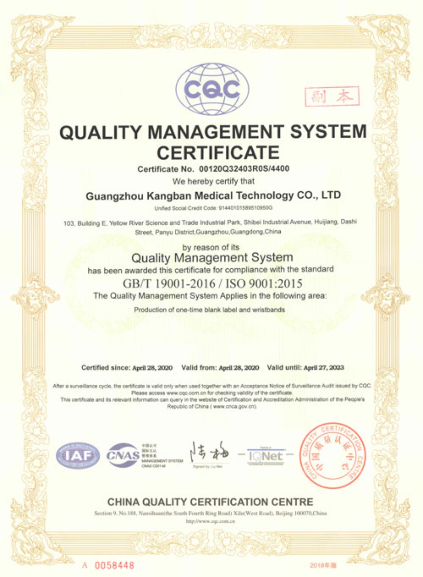 热烈祝贺广州康伴医疗科技有限公司通过质量管理体系GB/T 19001-2016 / ISO 9001:2015认证!